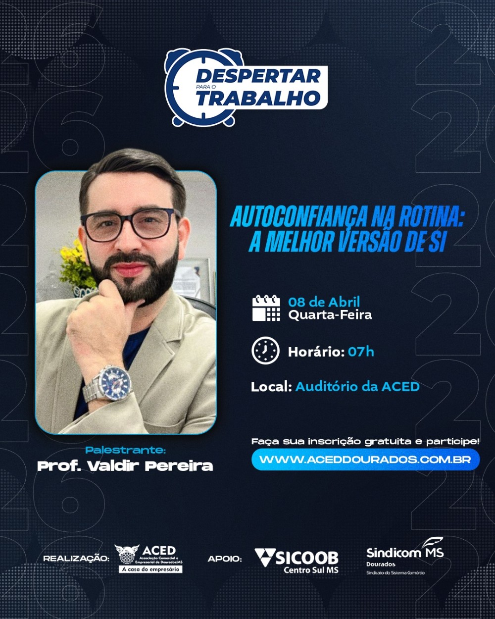 A Associação Comercial e Empresarial de Dourados (ACED) realiza no próximo dia 8 de abril, às 7h, mais uma edição do Despertar para o Trabalho, iniciativa tradicional voltada à capacitação profissional e ao fortalecimento do ambiente profissional na cidade. O encontro será no auditório da entidade e terá como tema “Autoconfiança na rotina: a melhor versão de si”.