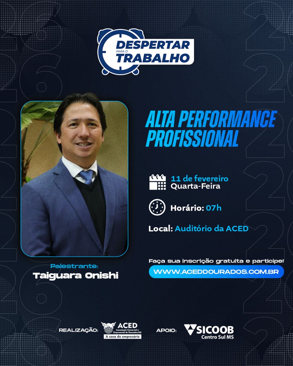 O presidente da ACED, Everaldo Leite Dias, reforça o convite para quem ainda não garantiu vaga. “O Despertar para o Trabalho é um programa que faz a diferença no desenvolvimento das pessoas e das empresas. Começamos 2026 com uma palestra de alto nível e convidamos todos a participarem desse momento de aprendizado gratuito”, destaca.
